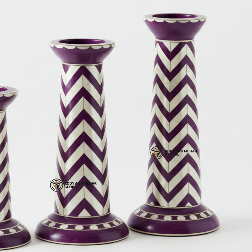 ผู้จัดจำหน่ายชาวอินเดียเสนอเชิงเทียนทรงเรียวฝังเปลือกหอย/มุกหรูหรา ลายเรขาคณิตเชฟรอนสีม่วงและสีขาว