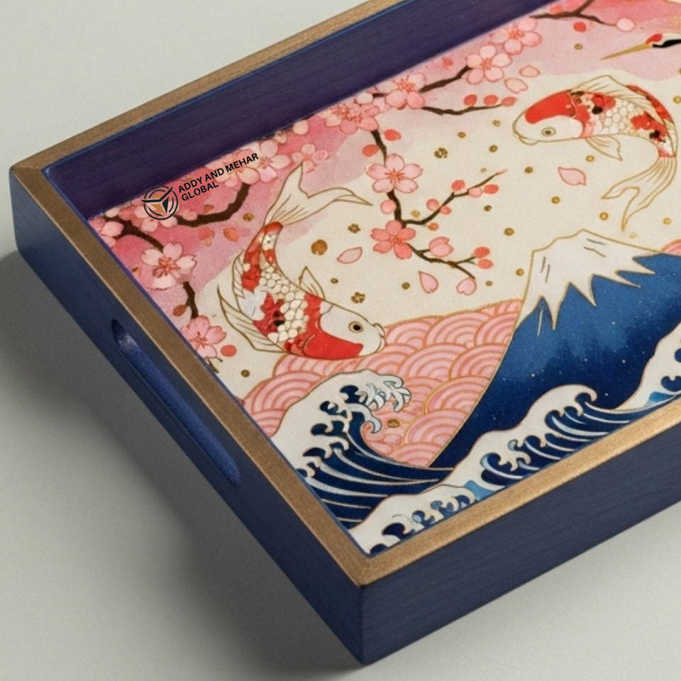 ถาดไม้ทำมือสไตล์อินเดีย ยี่ห้อ Meena ทนทาน ลายปลาคราฟและนกกระเรียน สำหรับเสิร์ฟอาหาร ชา กาแฟ ตกแต่งบ้านสไตล์เอเชีย