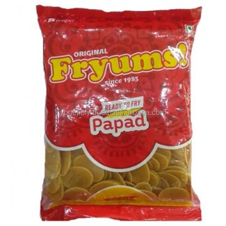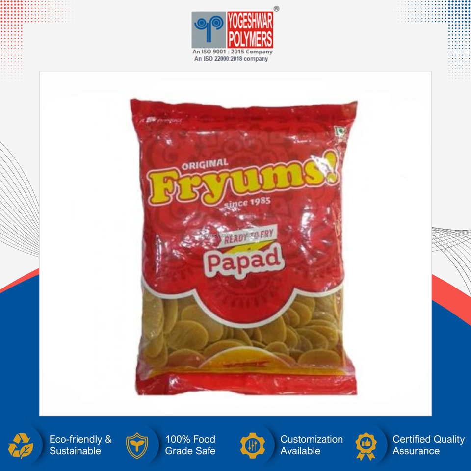 ซัพพลายเออร์อินเดียขายดี คุณภาพเยี่ยม บรรจุภัณฑ์พลาสติกสำหรับใส่ปาปาดแบบม้วน ปิดผนึกตรงกลาง เกรดอาหาร ยี่ห้อ YOGESHWAR POLYMERS รุ่น YP41