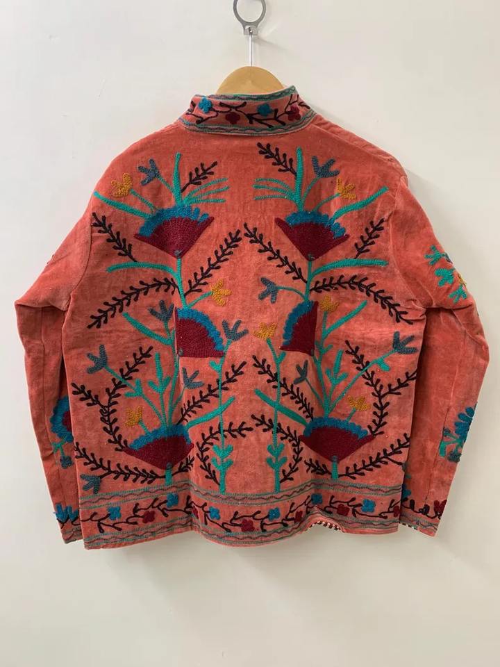 Suzani เสื้อแจ็กเก็ตสั้นปักลายกำมะหยี่สไตล์วินเทจของผู้หญิงเสื้อแจ็คเก็ตลำลอง