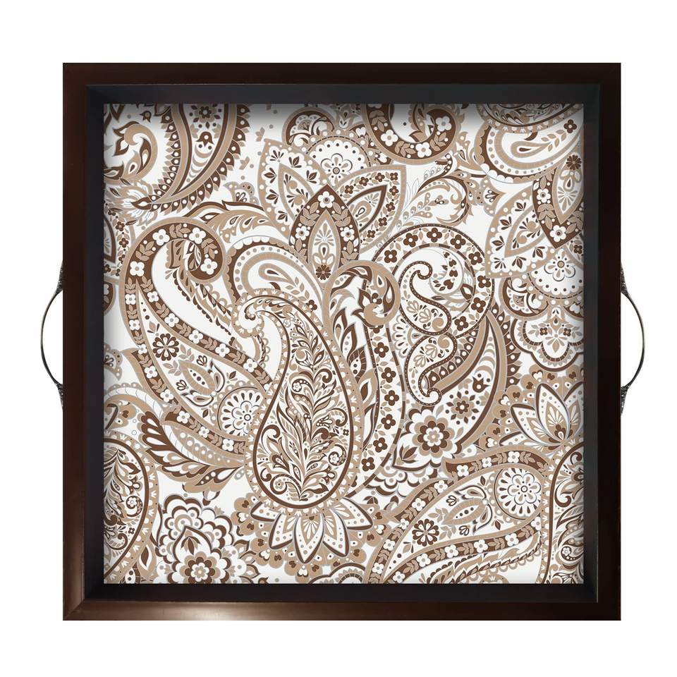 ถาดเสิร์ฟไม้ลายผ้าอินเดียทรงสี่เหลี่ยมพร้อมหูจับโลหะ สำหรับโต๊ะอาหาร บ้าน และสำนักงาน เหมาะสำหรับเป็นของขวัญ