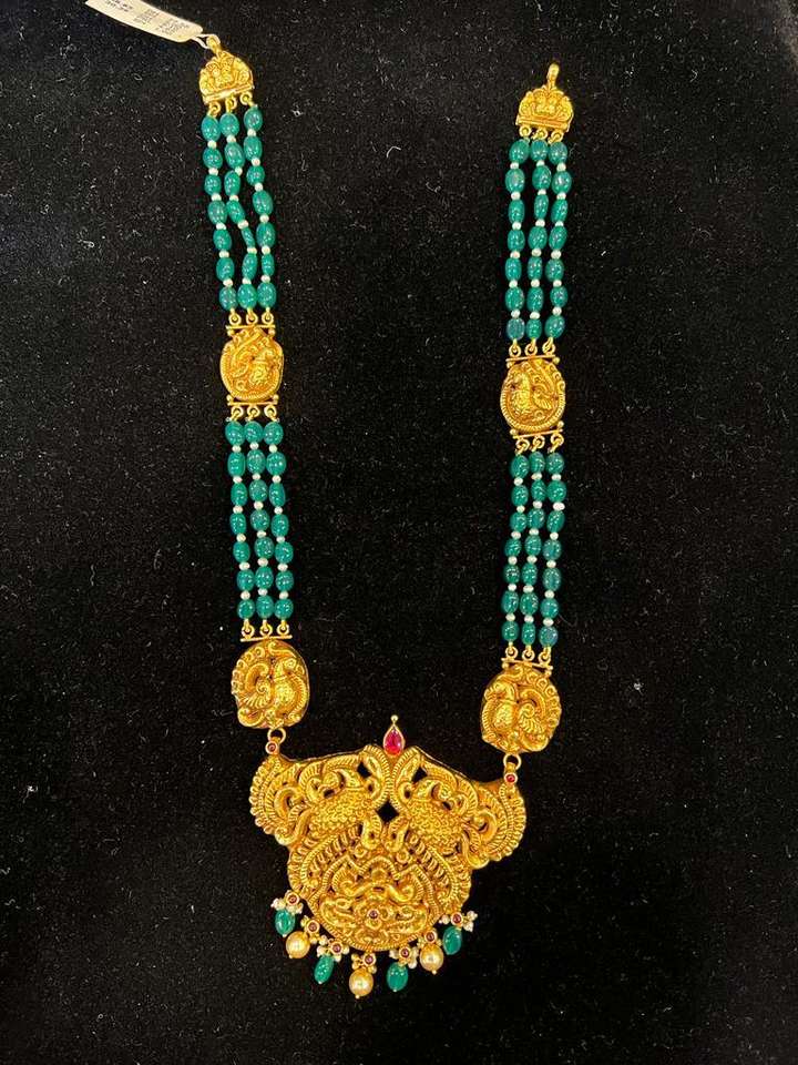 ชุดสร้อยคอยาวแบบโบราณของอินเดีย ทำจากทอง 22K ประดับด้วยไข่มุกและลูกปัดสีเขียว | ชุดเจ้าสาวลายพิมพ์นกยูง