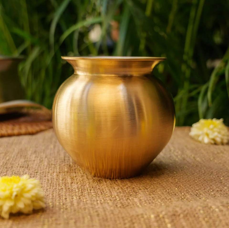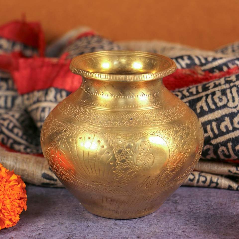 หม้อโลต้าทองเหลืองแบบอินเดียโบราณ งานแฮนด์เมด ลายนูน ลวดลายมงคล ของขวัญเพื่อสุขภาพ ของตกแต่งบ้าน