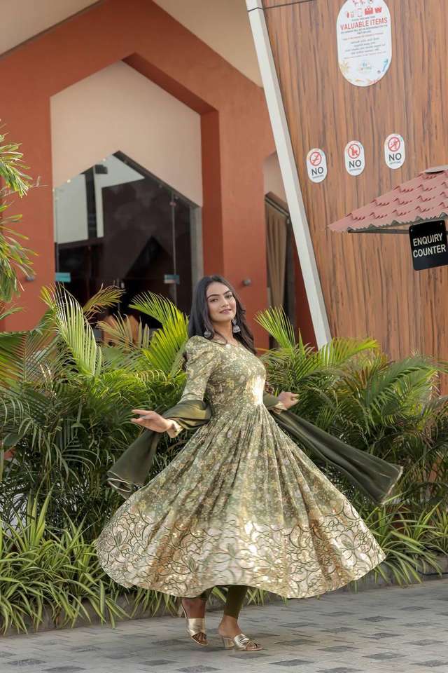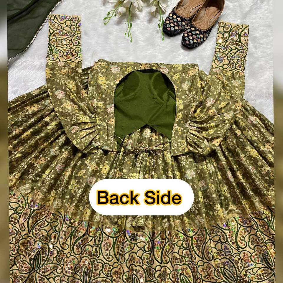 Indian Traditional Designer Silk Material Rambo Sequence and Digital Printed Anarkali Top With Pant and Faux Georgette Dupatta