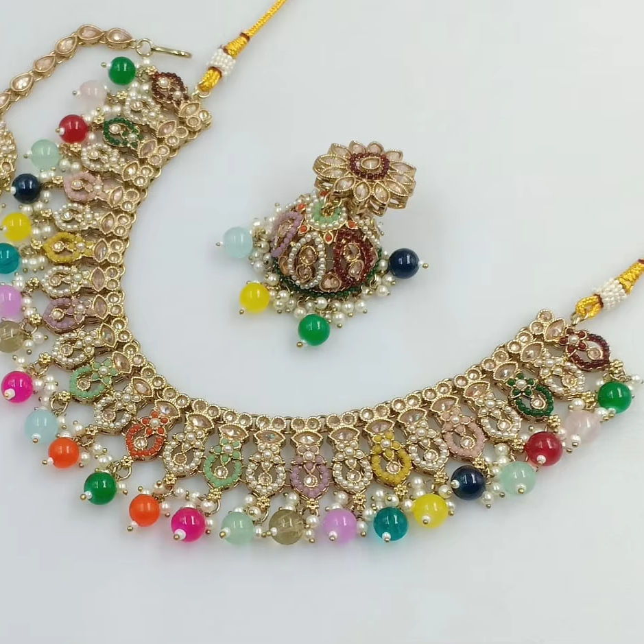ชุดต่างหูและสร้อยคอ Jhumka ชุบทองแบบดั้งเดิมของอินเดียสำหรับผู้หญิงดีไซน์แบบห้อยและไข่มุกสำหรับงานปาร์ตี้ผู้หญิงและเด็กผู้หญิง