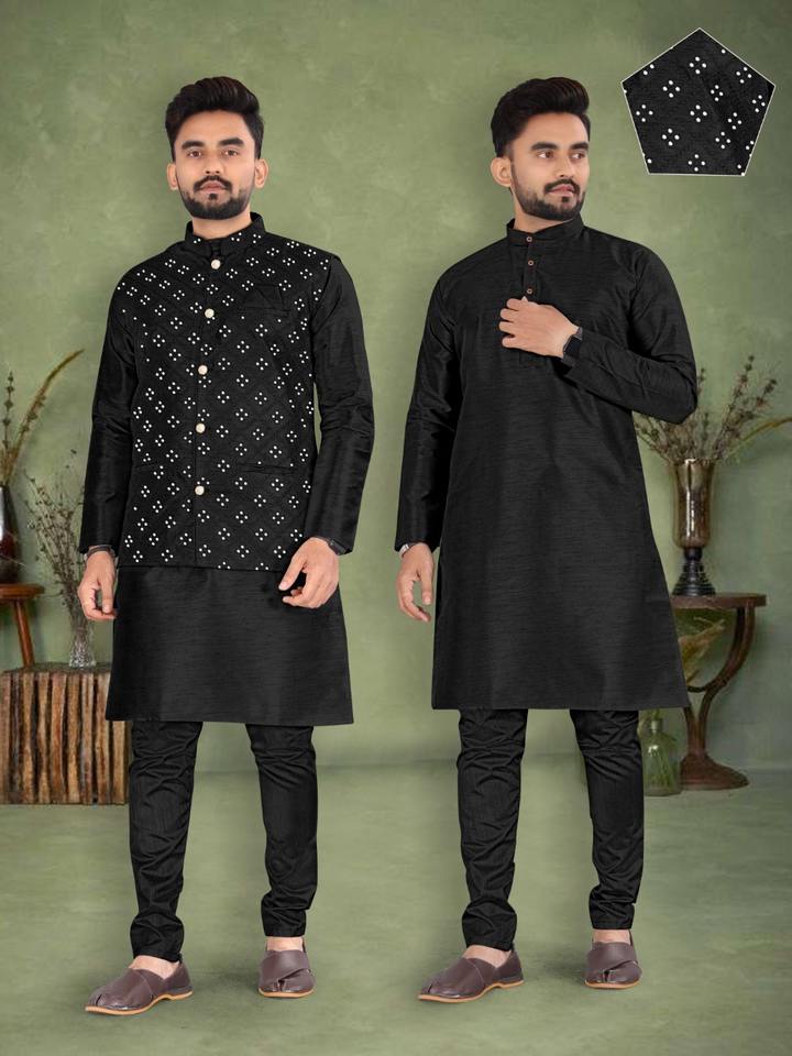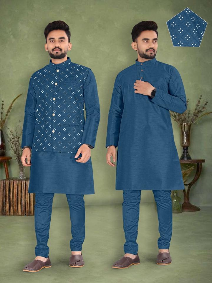 ชุดปาร์ตี้แบบดั้งเดิมของอินเดีย ผ้าไหมบังลอรีเนื้อหนา พร้อมซับในในชุดคุर्ตา พร้อมกางเกงปاجามาและเสื้อโคติสำหรับผู้ชาย ราคาขายส่งจากเมืองสุรัต