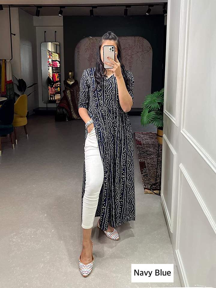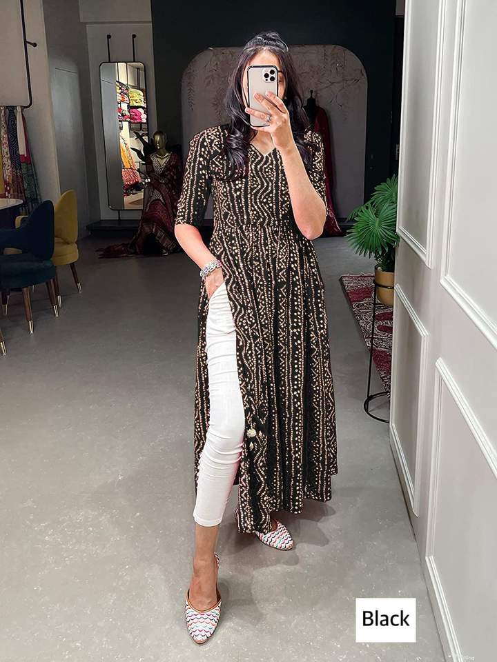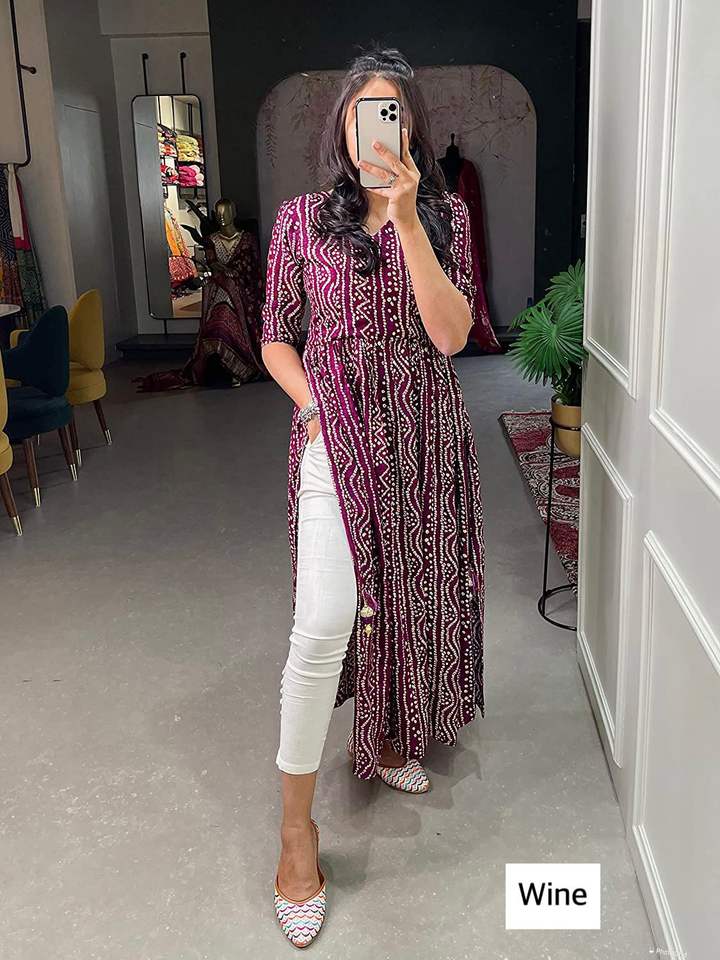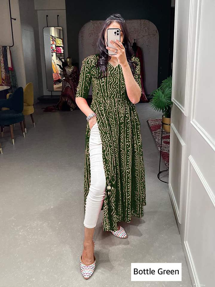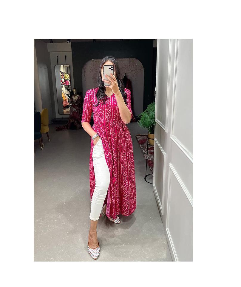 ชุดคลุมผ้าเรยอนแบนฮานีสำหรับผู้หญิงชุดคลุมสไตล์อินเดียดั้งเดิมพิมพ์ลาย nayra bandhej kurti