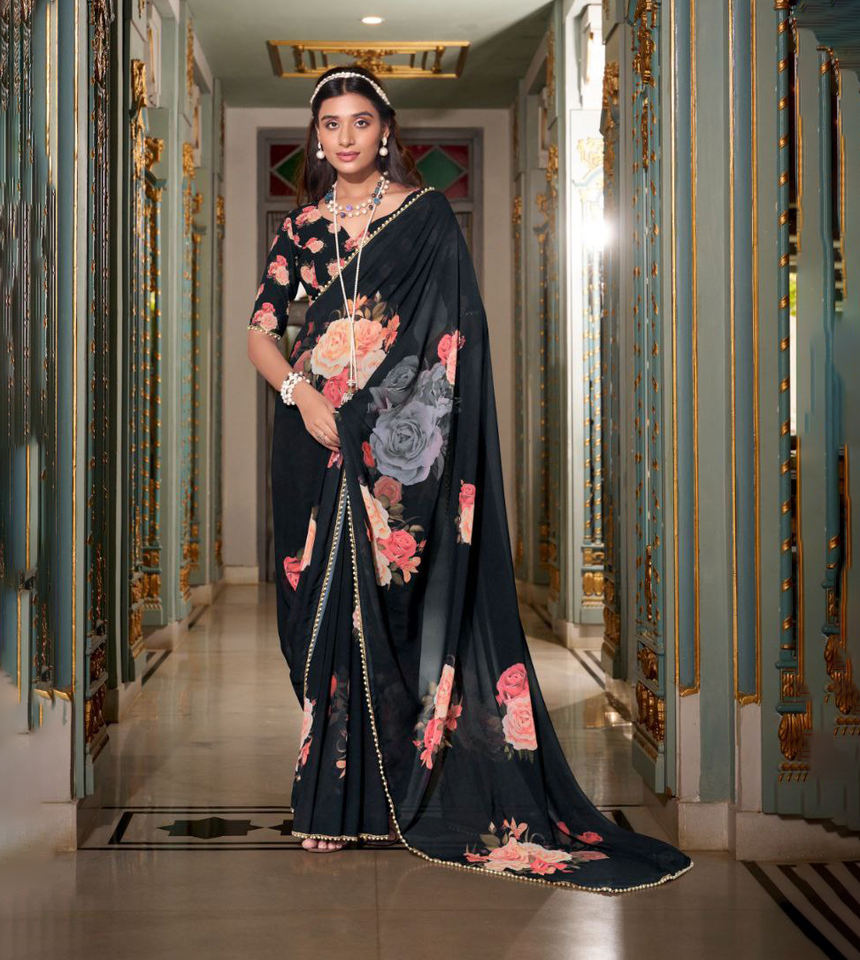 ผ้าส่าหรีอินเดียแบบมีระบายสวยงาม ดีไซน์เนอร์แบรนด์ดัง ผ้าจอร์เจตต์เทียม ตกแต่งด้วยด้าย เหมาะสำหรับงานปาร์ตี้และงานแต่งงาน ขายดีที่สุด