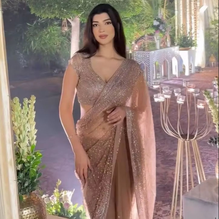 ผ้าซารีอินเดียแบบนิ่มทันสมัย ประดับด้วยลูกปัดขนาด 3-5 มม. ลายพิมพ์ดิจิทัล เหมาะสำหรับงานแต่งงานและงานปาร์ตี้ พร้อมเสื้อคลุมแบบยังไม่เย็บติดกับผ้า สามารถปรับแต่งได้ตามต้องการ รับผลิตแบบ OEM/ODM