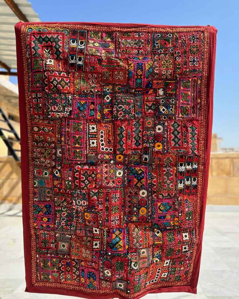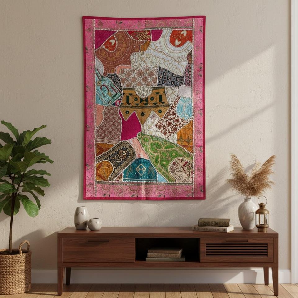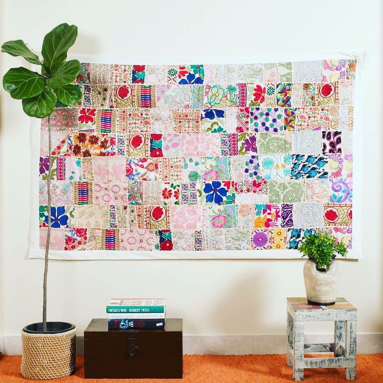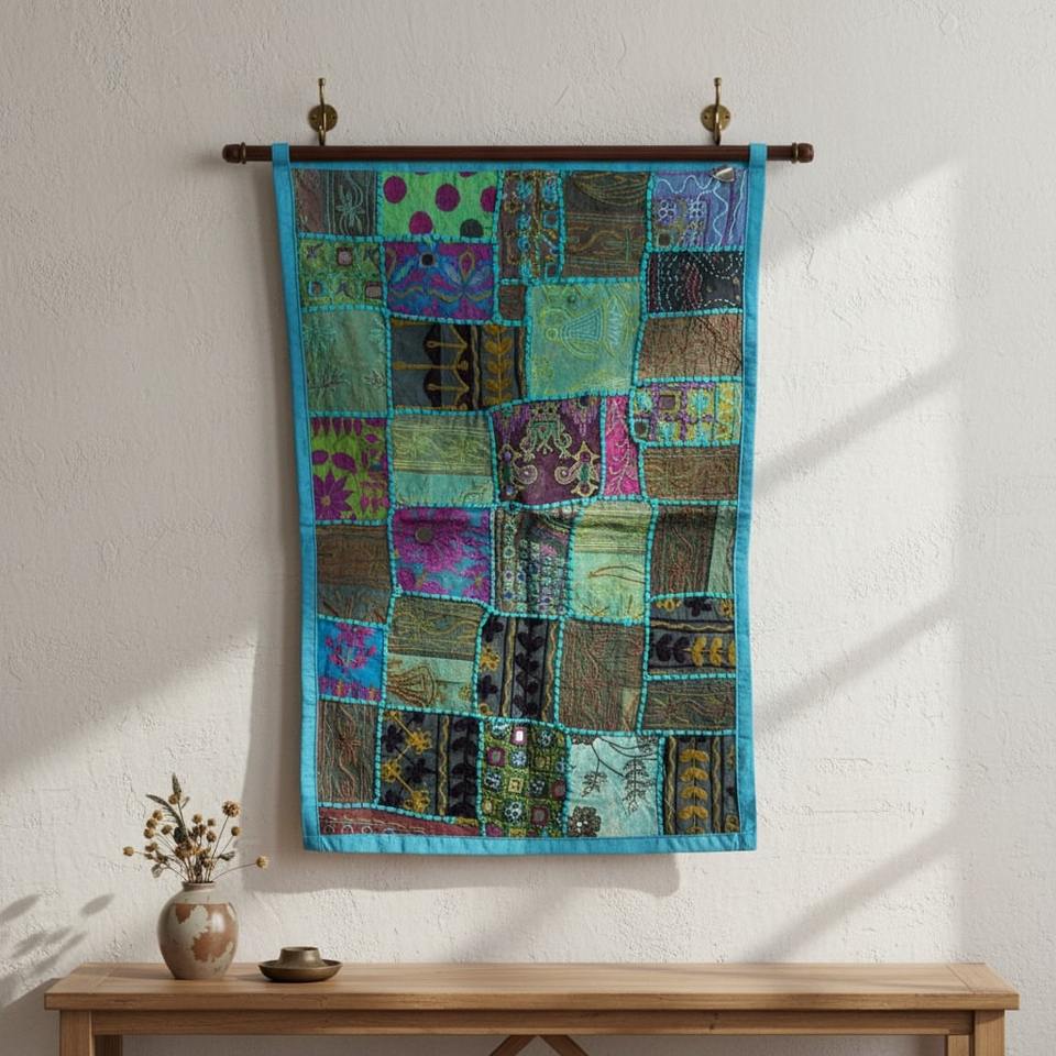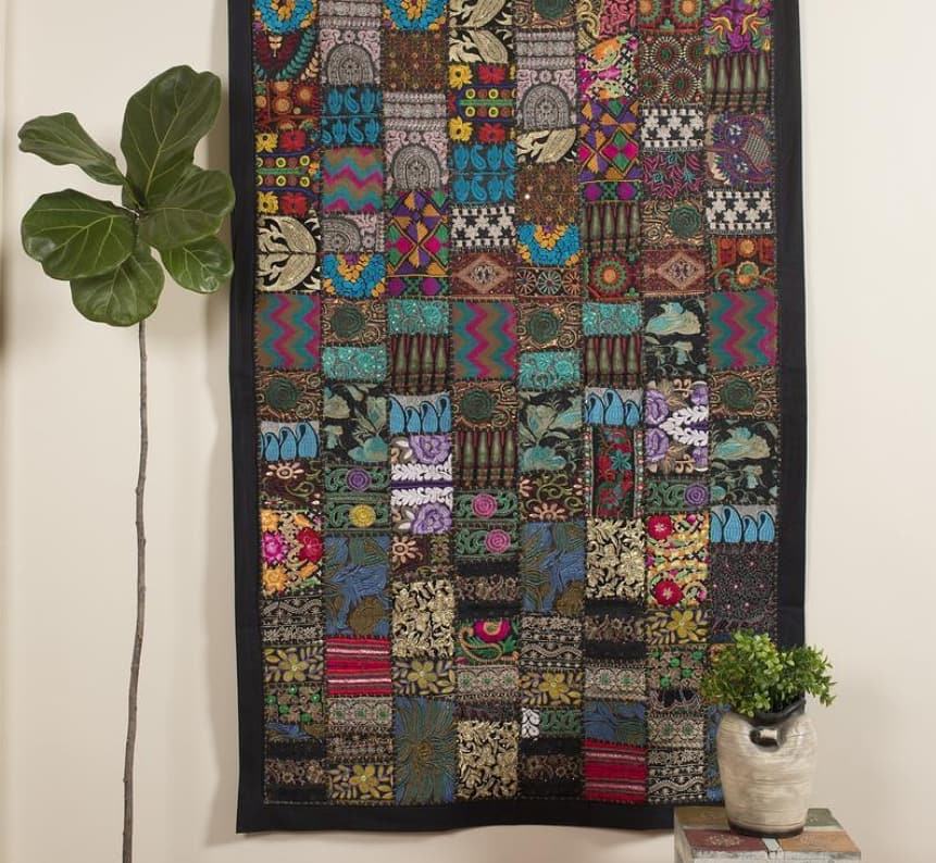ผ้าแขวนผนังตกแต่งบ้านสไตล์วินเทจอินเดีย ทำจากผ้าฝ้ายปะติดปะต่อ พร้อมงานปักสีสันสดใส ทำด้วยมืออย่างมีสไตล์