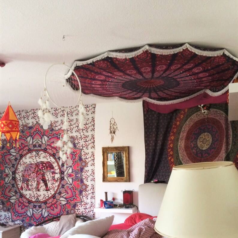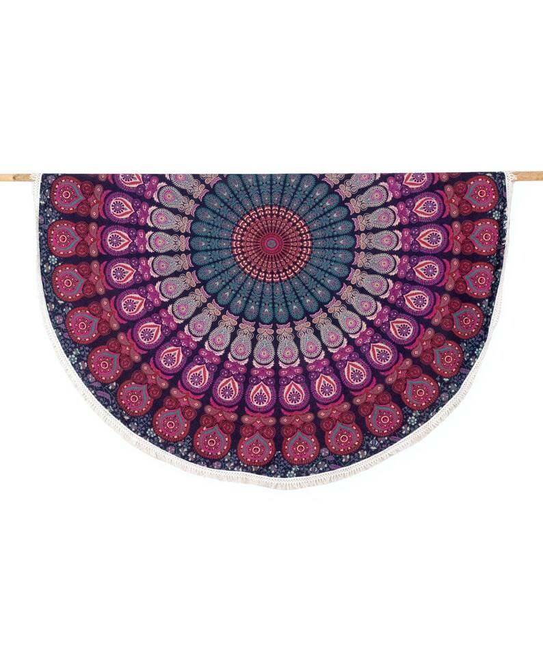 เสื่อโยคะคอกลมลายแมนดาลาแบบแขวนติดผนังสไตล์อินเดียสำหรับหอพักพรมผ้าฝ้ายแท้มีขอบลูกไม้