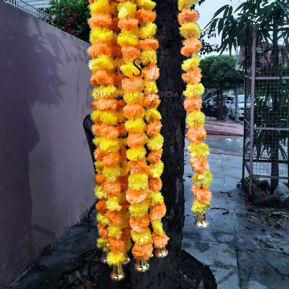 พวงมาลัยดอกดาวเรืองปลอมตกแต่งงานแต่งงานแบบอินเดียพร้อมกระดิ่งดอกไม้สายดอกไม้ประดิษฐ์พวงมาลัยตกแต่ง