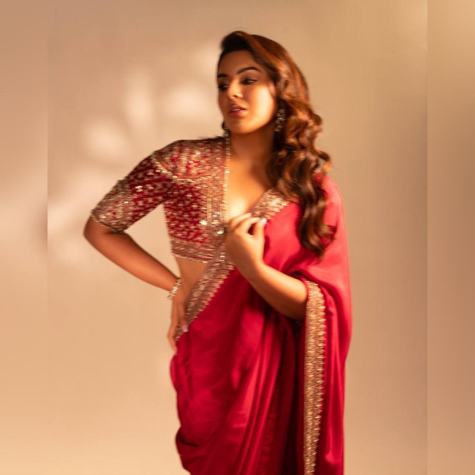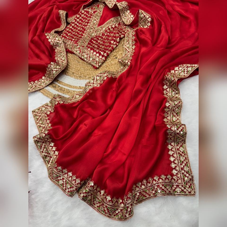 ชุดส่าหรีงานแต่งงานแบบอินเดีย ชุดเจ้าสาวแฟนซีสไตล์บอลลีวูด ผ้าไหมออร์แกนซ่าเนื้อหนัก ตกแต่งด้วยด้ายและเพชร แบบยังไม่ได้เย็บติด