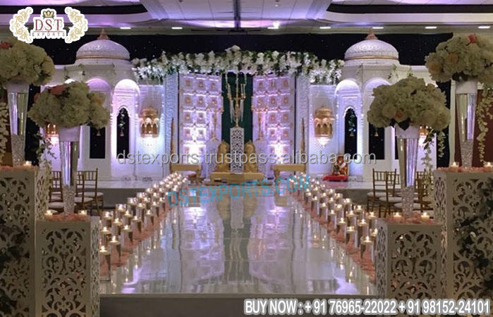 การต้อนรับงานแต่งงานของชาวอินเดียการตกแต่งเวทีสีทองการแต่งงานแบบดั้งเดิมเวทีสีทองสวยงาม Jaimala และ Nikah ตกแต่งเวที USA