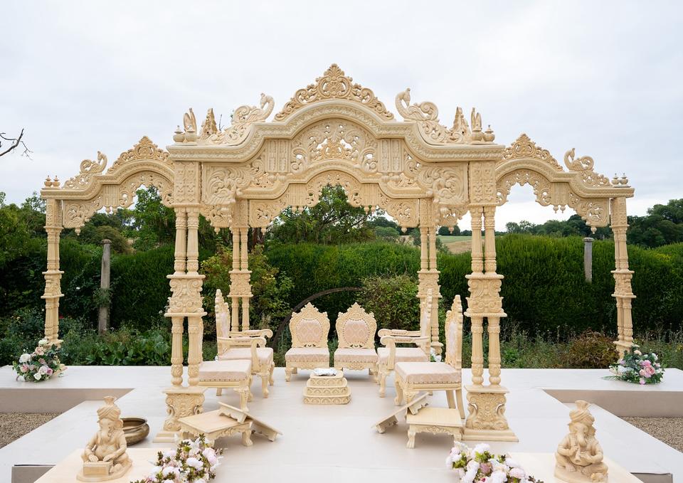 มณฑปงานแต่งงานแบบอินเดีย ทำจากวัสดุ FRP ลายไม้ สวยงามอลังการ มณฑปงานแต่งงานแบบมหารานีอินเดีย มณฑปงานแต่งงานแบบฮินดู ดีไซน์เนอร์ออกแบบมณฑปงานแต่งงานแบบสุลต่าน สหราชอาณาจักร