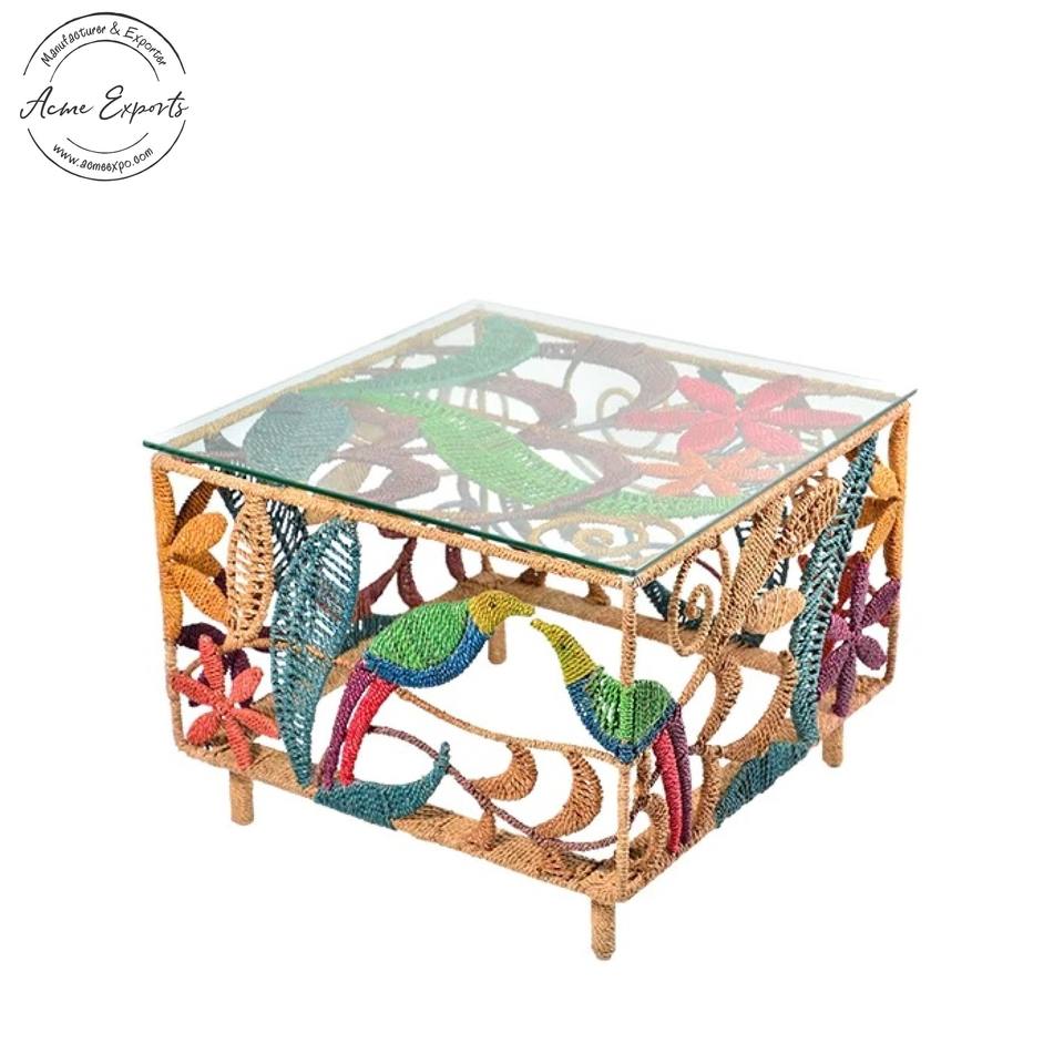 หญ้าทะเลหลากสีขนาดใหญ่แบบอินเดียโต๊ะข้างสี่เหลี่ยมพร้อมกระจกนิรภัยด้านบนสำหรับห้องนอนห้องนั่งเล่นห้องวาดภาพ