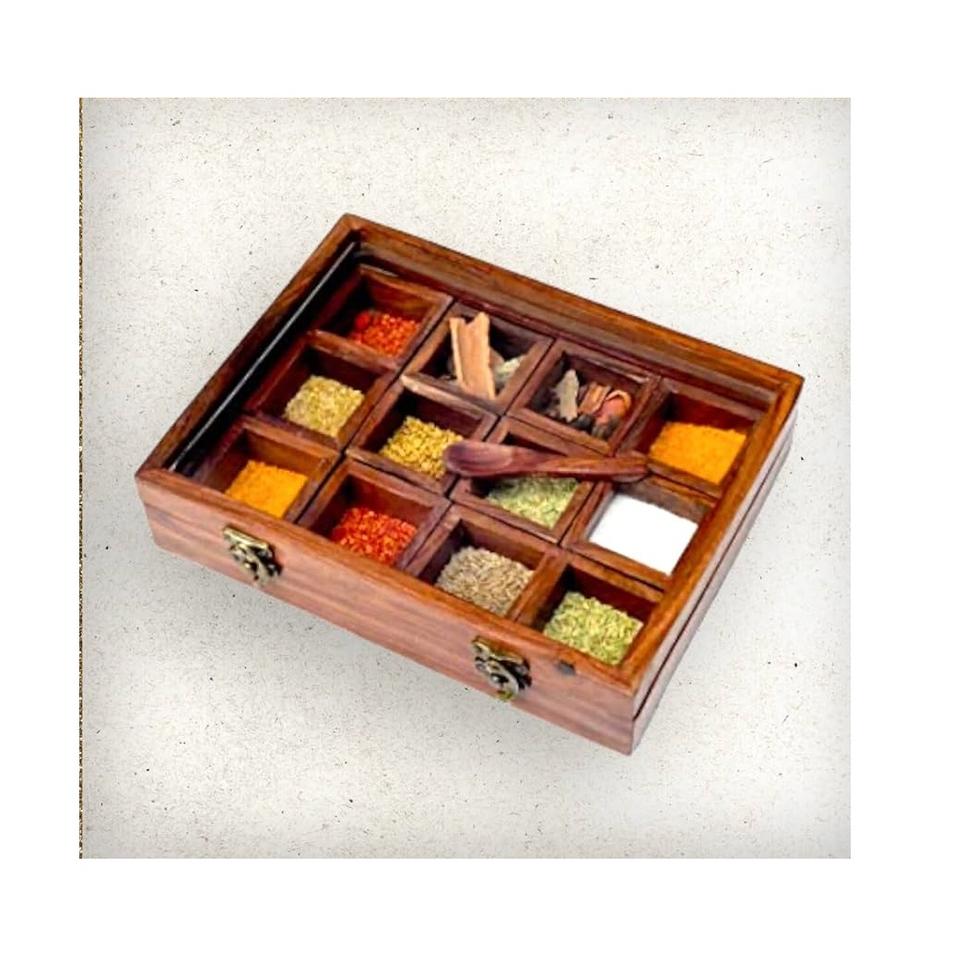 กล่องเครื่องเทศไม้แบบอินเดีย สำหรับใช้ในบ้าน ร้านอาหาร โรงแรม กล่องใส่เครื่องเทศมาซาลา ดับบา สำหรับจัดระเบียบและเก็บเครื่องเทศ ทำด้วยมือ 100%