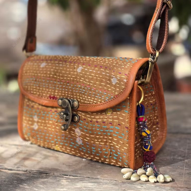 กระเป๋าโท้ทปักลายทำมือสไตล์อินเดีย กระเป๋าสะพายไหล่แบบปะติดลายชนเผ่า พร้อมขอบหนังสำหรับผู้หญิง