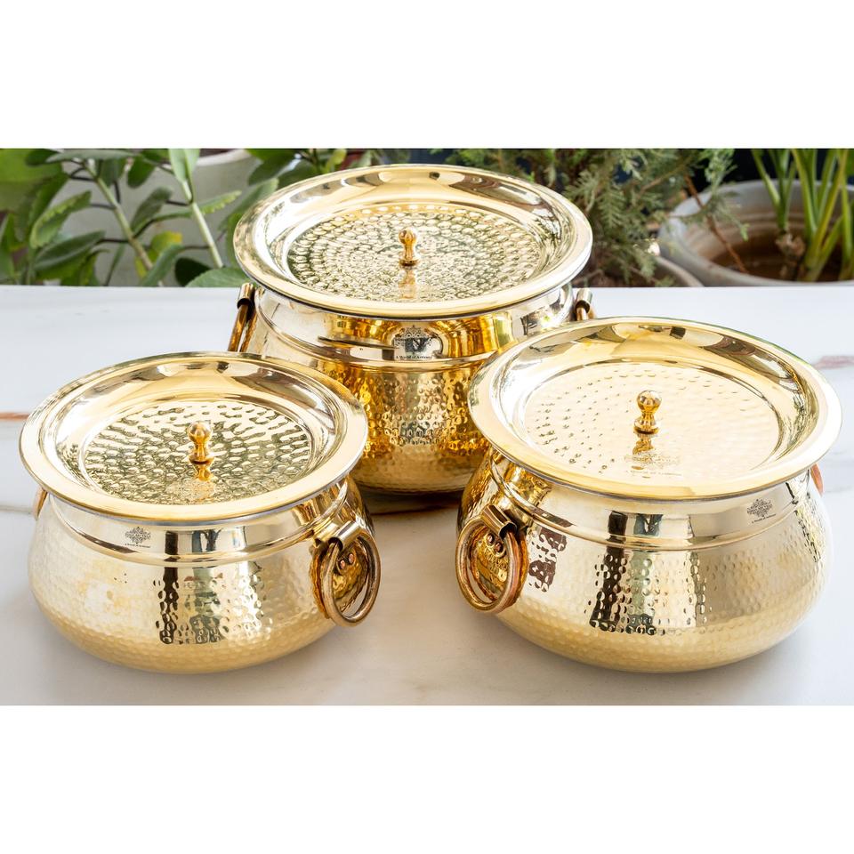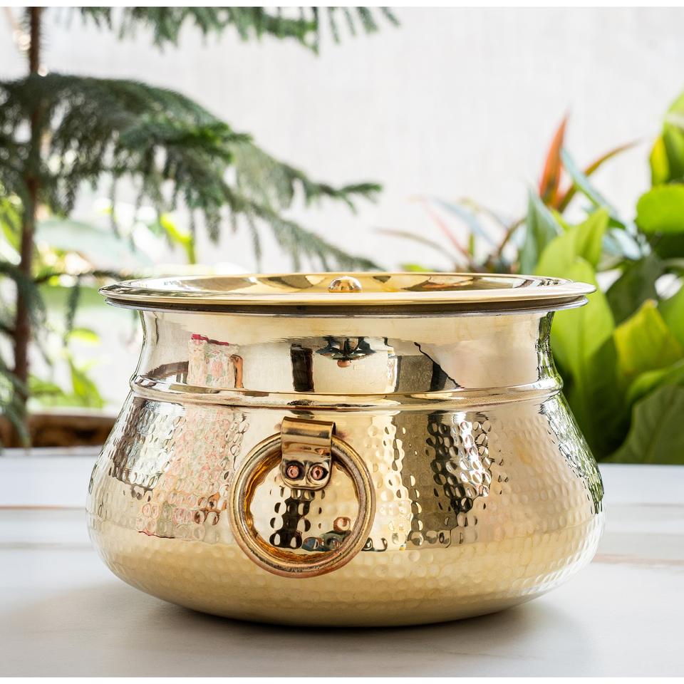 Indianartvilla หม้อดีจิดีไซน์แบบทุบทำจากทองเหลืองบริสุทธิ์พร้อมซับในดีบุกพร้อมฝา-ปรุงอาหารสำหรับจัดเก็บและเสิร์ฟ