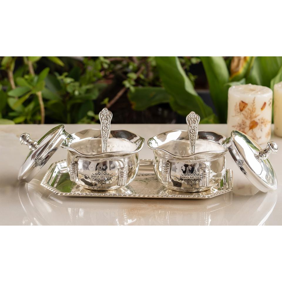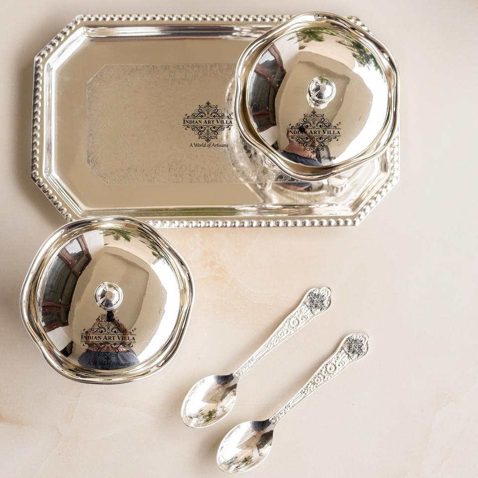 IndianArtVilla Silver Plated Designer Bowl Set with 2 Spoon Tray-180 ML for Serving & Storage