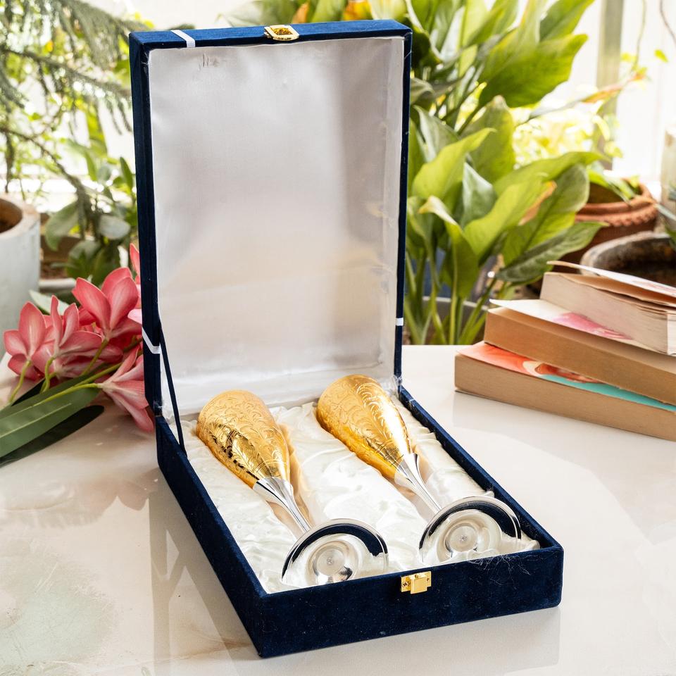 Indianartvilla แก้วแชมเปญสีทองและสีทองเหลืองพร้อมกล่องสีฟ้า-ชุด2ชิ้นอุปกรณ์สำหรับบาร์สำหรับโรงแรมและร้านอาหาร