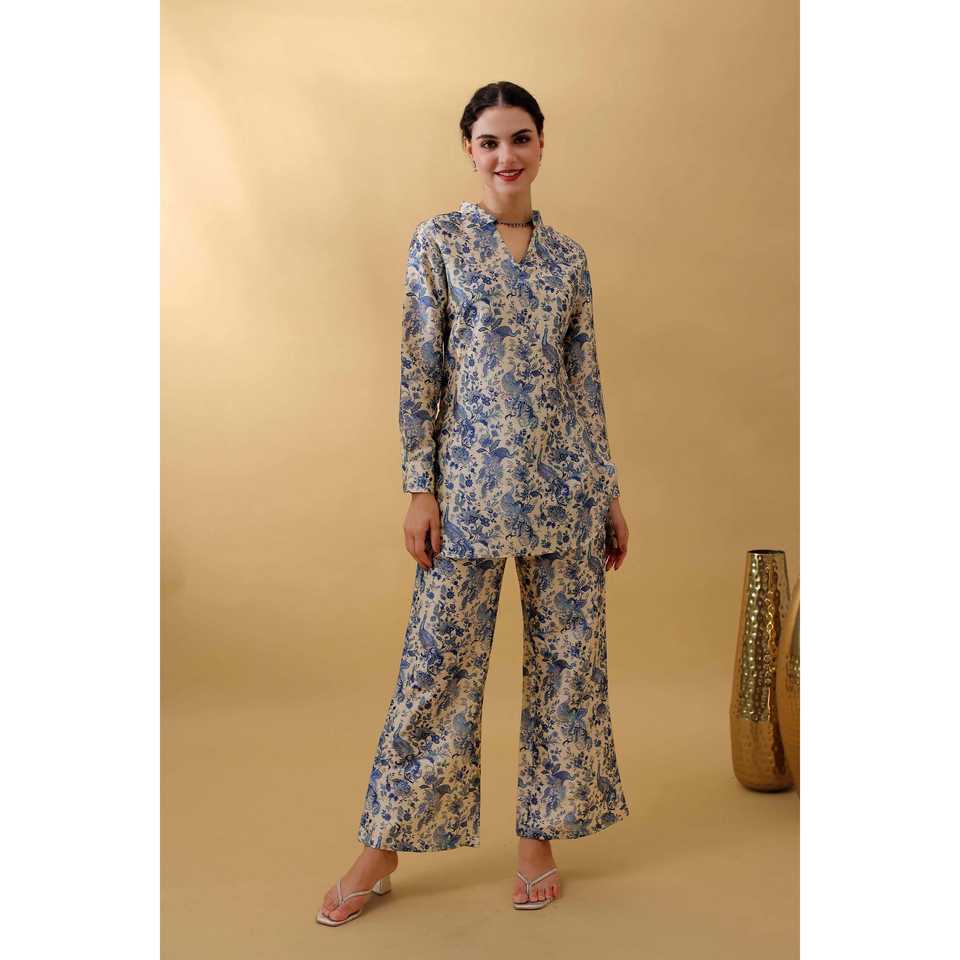 ชุดเซ็ตพิมพ์ลาย Indigo Bloom แบบเป็นทางการ พร้อมคอเสื้อแบบจีนสุดหรู กางเกงขากว้างสวมใส่สบาย ขอบเอวยางยืดแบบผ้าไหม