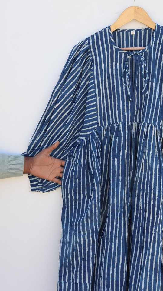 เดรสสั้นผ้าฝ้ายแท้ 100% ลายดอกสีคราม พิมพ์ลายด้วยมือ ทรงปกติ สไตล์โบโฮ แขน 3/4 คอวี ทรงเอไลน์ สำหรับฤดูร้อนและฤดูใบไม้ร่วง