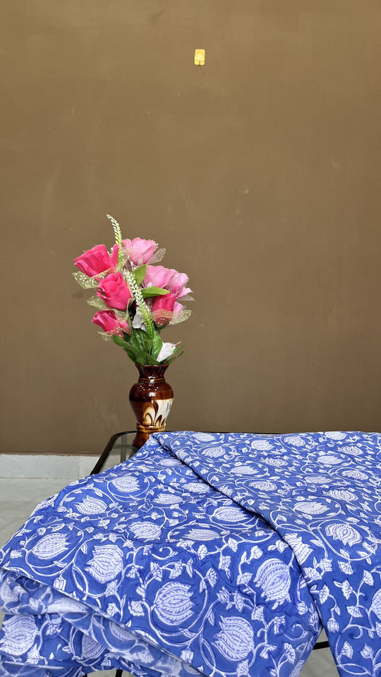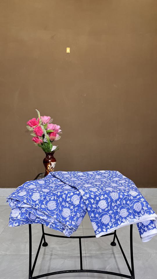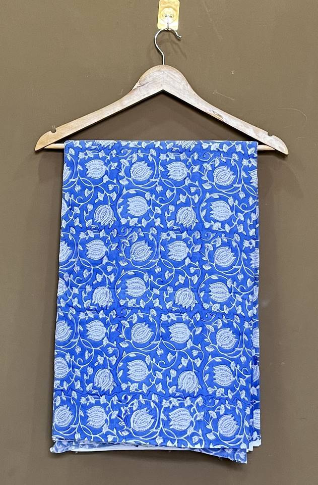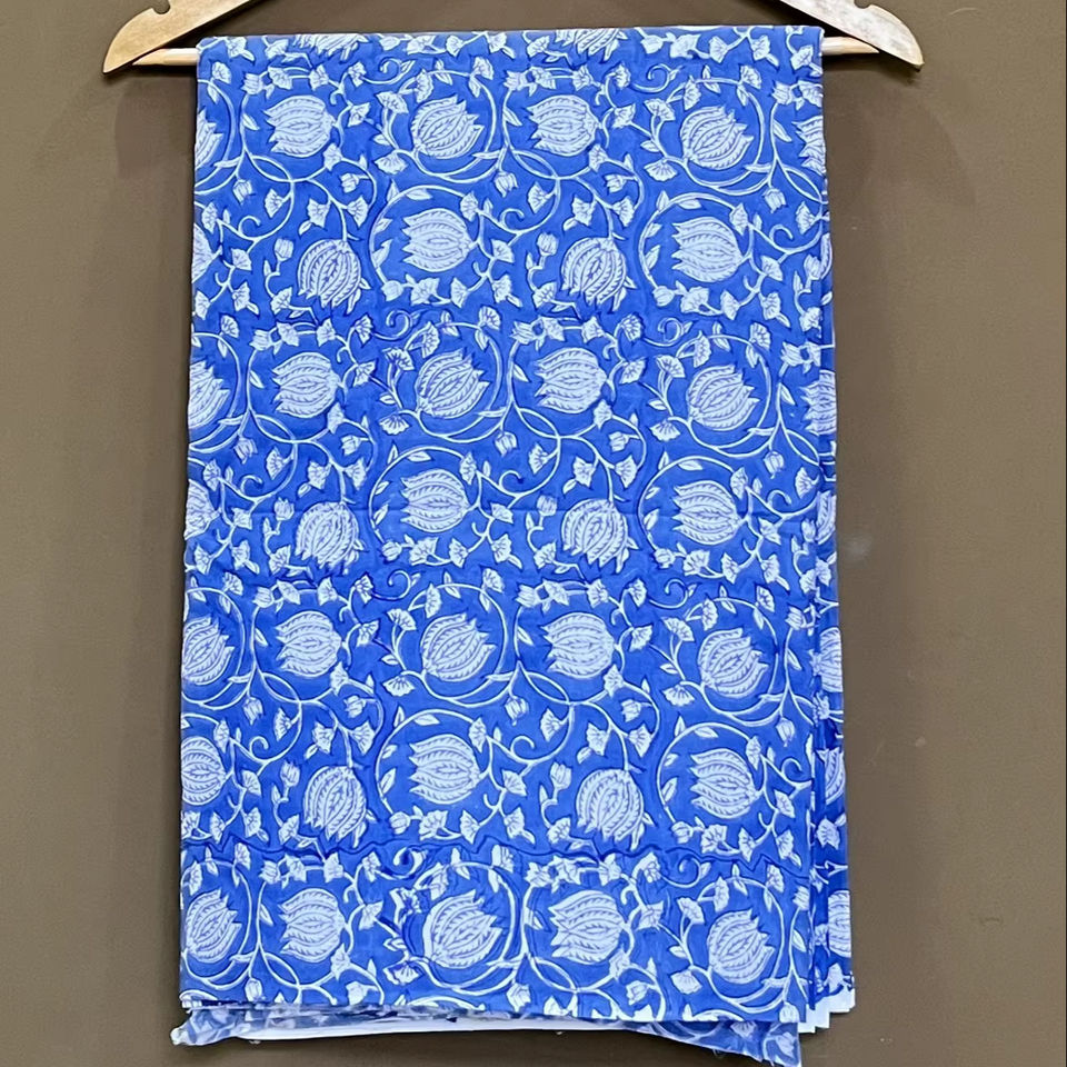 ผ้าฝ้ายพิมพ์ลายด้วยมือแบบอินดิโก้: ลายดอกไม้และเถาวัลย์แบบมุกฮาล ขายเป็นหลา
