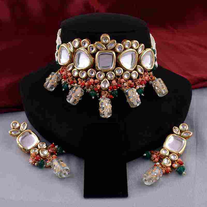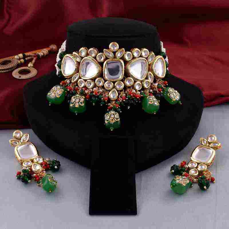 ชุดสร้อยคอแบบคุนดันสไตล์อินโดพร้อมทองเหลืองชุบทองประดับเพชรซิร์คอน