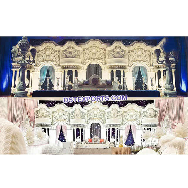 ธีมงานแต่งงานแบบอินโด-ตะวันตก ตกแต่งเวทีงานเลี้ยงฉลองมงคลสมรส ด้วยเวทีไฟเบอร์สุดอลังการ สไตล์พระราชวังอเมริกัน ตกแต่งเวทีงานแต่งงานธีมพระราชวังอเมริกันสุดอลังการ