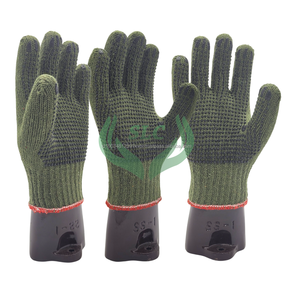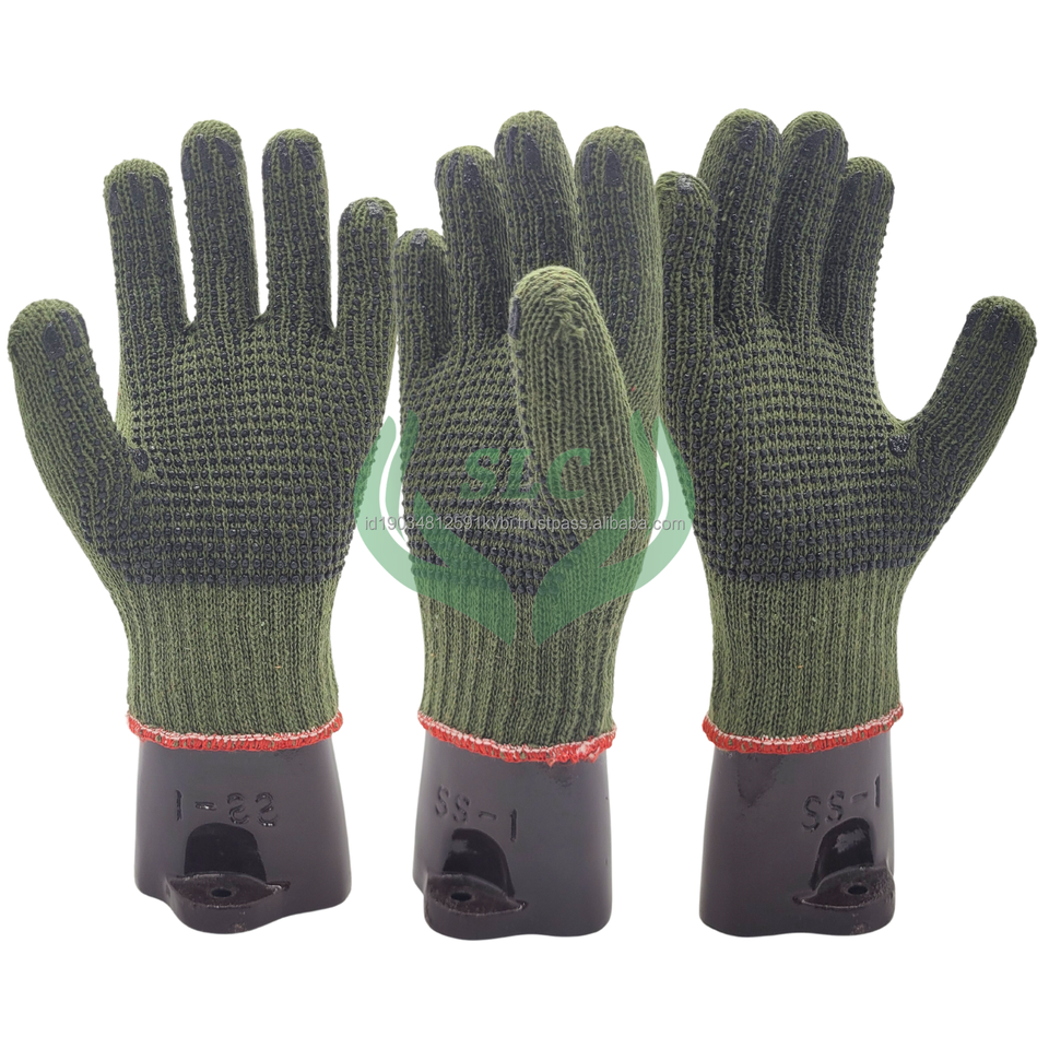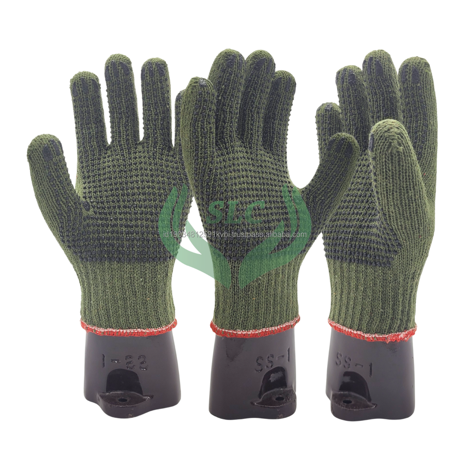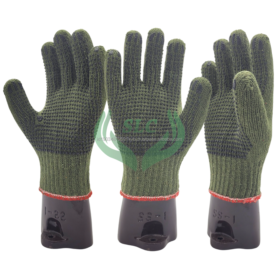 ถุงมือทำงานทำจากผ้าฝ้ายสีเขียวทหารทำจากอินโดนีเซียถุงมือเพื่อความปลอดภัยป้องกันการลื่นป้องกันการกระแทก