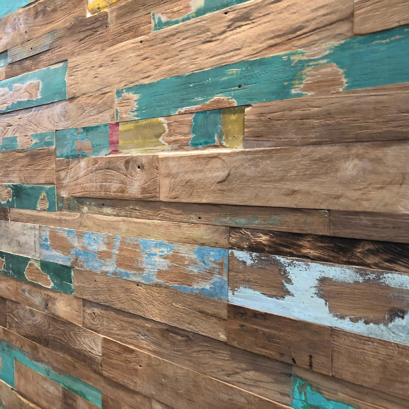 แผ่นผนังไม้สักอินโดนีเซียแบบรีเคลม ดีไซน์ลายเรขาคณิตมินิมอล ดูดซับเสียงได้ง่าย ใช้ตกแต่งพื้นบ้าน