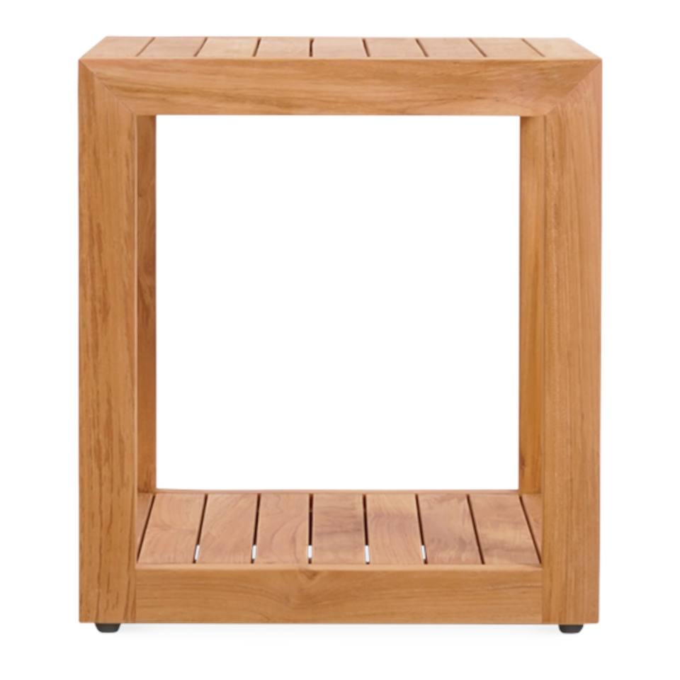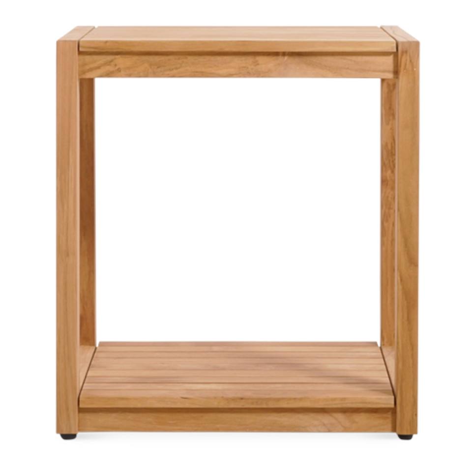 โต๊ะข้างไม้สักอินโดนีเซียสำหรับกลางแจ้ง ทนทานต่อสภาพอากาศ รูปทรงสี่เหลี่ยม พร้อมชั้นวางของแบบระแนง สำหรับเฟอร์นิเจอร์สวน