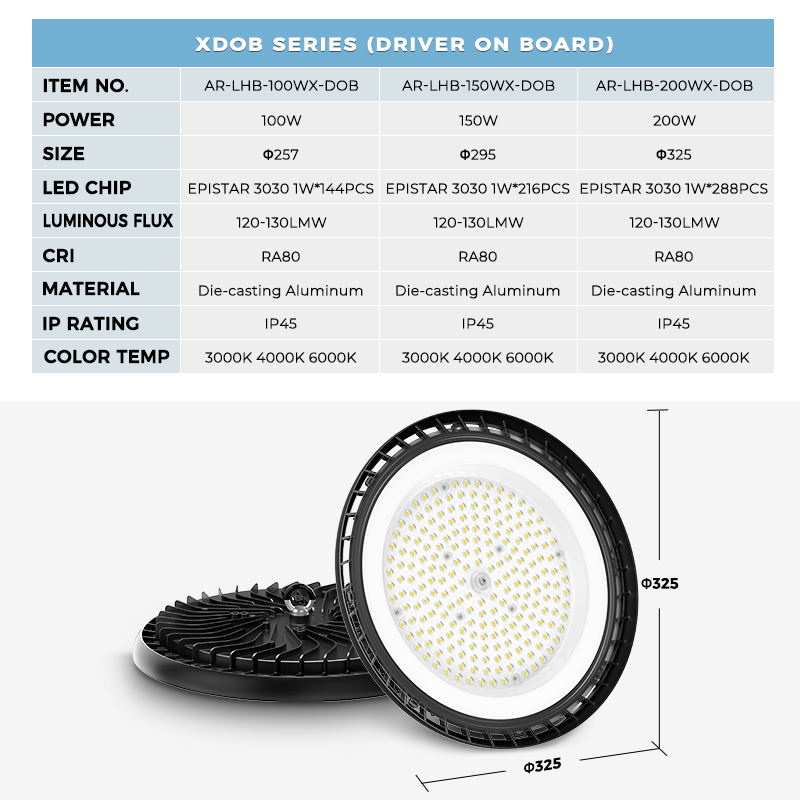 ไฟไฮเบย์เชิงพาณิชย์สำหรับใช้ภายในอาคาร ตัวเรือนอะลูมิเนียม แบบ DOB UFO สำหรับไฟไฮเบย์ 100 วัตต์ 5000K IP45 Ra80 ความสว่างสูง เหมาะสำหรับคลังสินค้าและโรงงาน