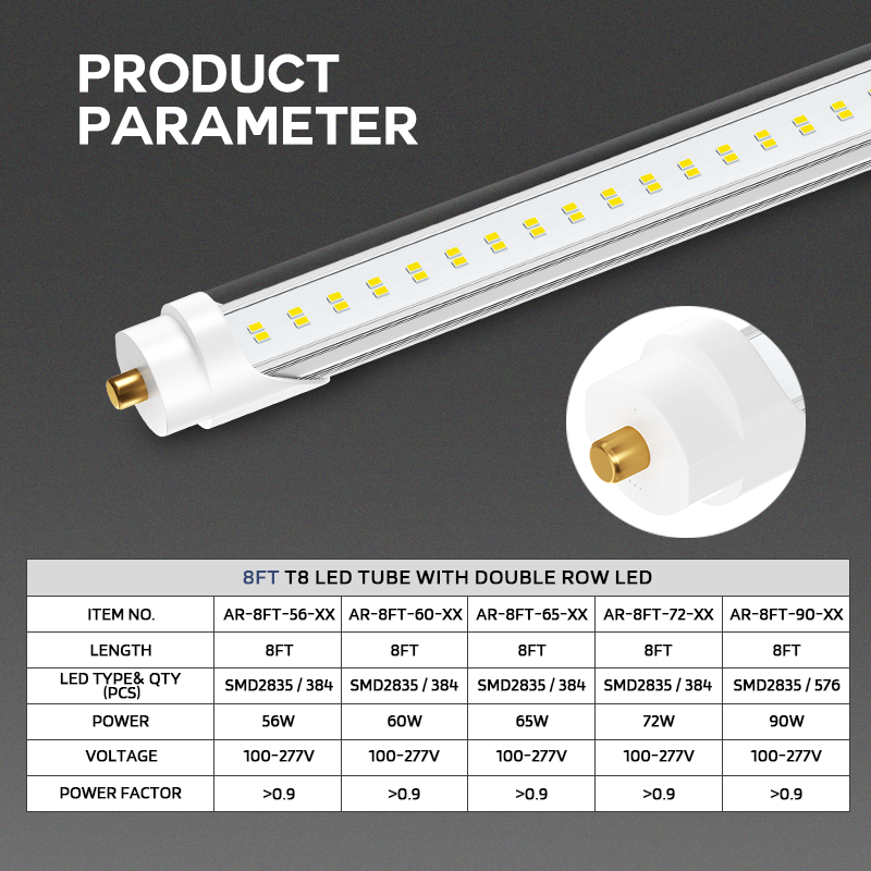 หลอดไฟ LED T8 ขนาด 8 ฟุต 90 วัตต์ สำหรับใช้ภายในอาคาร ได้รับมาตรฐาน ETL CE ROHS พร้อมแถบ LED สองแถว รองรับแรงดันไฟฟ้า 110-277 โวลต์ เหมาะสำหรับขายส่งในซูเปอร์มาร์เก็ตและโรงงาน