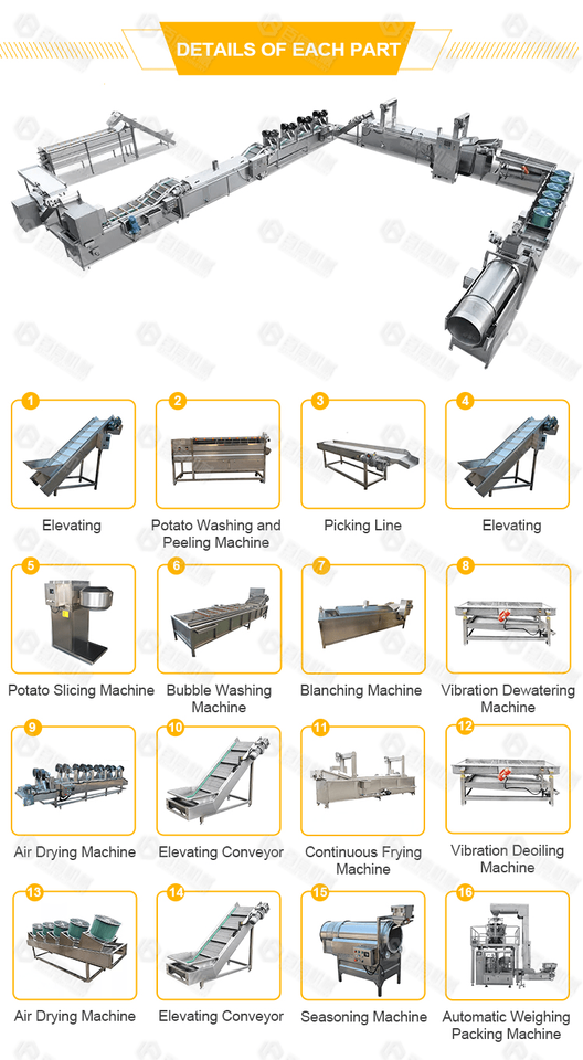 สายการผลิตมันฝรั่งทอดระบบอัตโนมัติ300-2000กิโลกรัม/ชั่วโมงสภาพใหม่เครื่องทำมันฝรั่งทอด