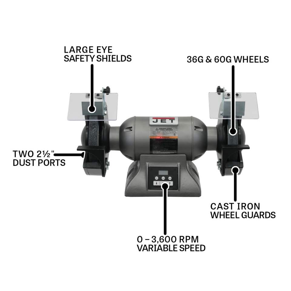 เครื่องเจียรแบบตั้งโต๊ะอุตสาหกรรมขนาด 8 นิ้ว ปรับความเร็วได้ 1 แรงม้า 115/230 โวลต์ 1 เฟส ใช้ไฟฟ้าสำหรับงานเจียร