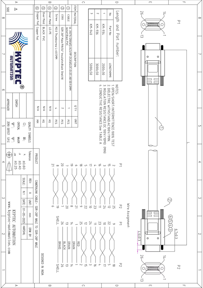 สายเคเบิลเชื่อมต่อกล้องอุตสาหกรรม SDR-26P ตัวผู้ ถึง SDR-26P ตัวผู้ สายเคเบิลส่งข้อมูลความเร็วสูงสำหรับระบบวิชั่น