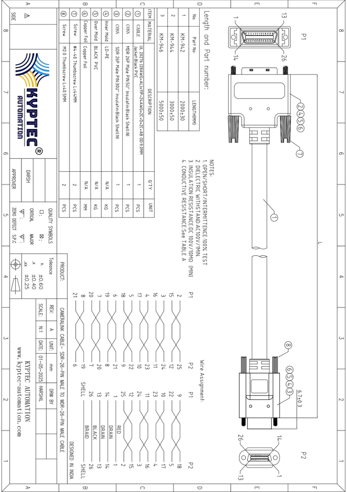สายเชื่อมต่อกล้องอุตสาหกรรม: สายเคเบิล SDR-26 พิน ตัวผู้ ไปยัง MDR-26 พิน ตัวผู้ สำหรับระบบถ่ายโอนข้อมูลความเร็วสูงสำหรับการมองเห็นด้วยเครื่องจักร