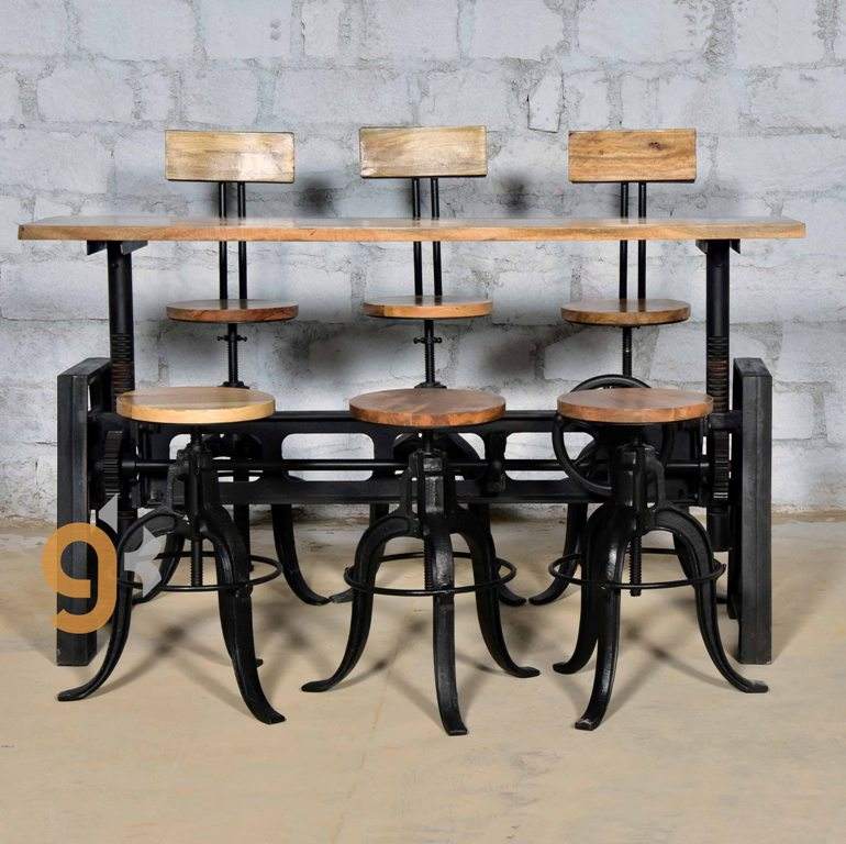 Industrial Cast Iron Crank Dining Table Set Adjustable Height Metal and Oak Foldable for Home Kitchen Living Room Use