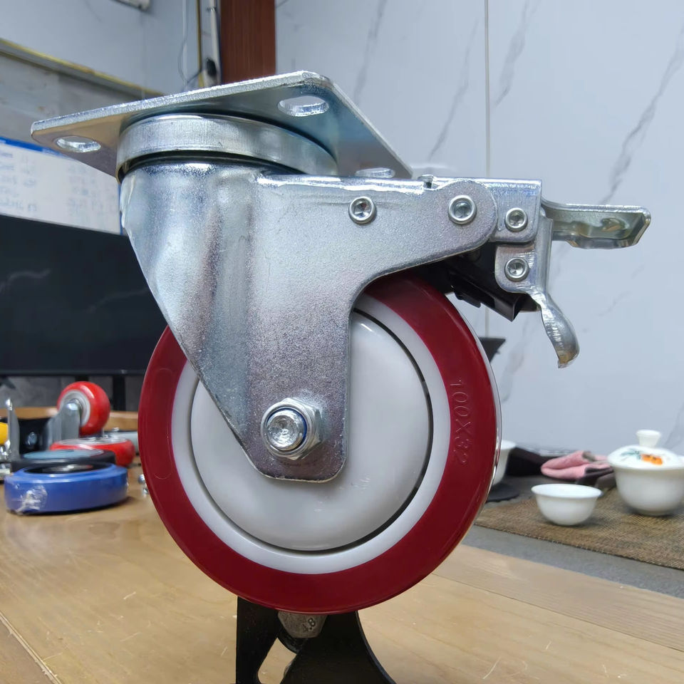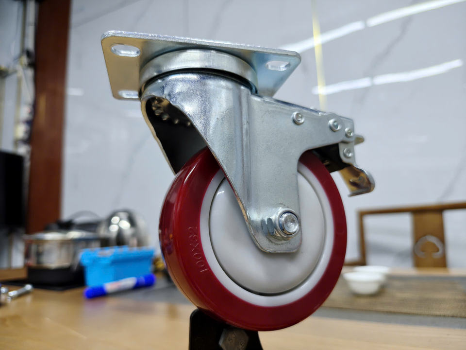 ล้อเลื่อนอุตสาหกรรม ยาง PU สีแดง ขนาด 3-4-5 นิ้ว พร้อมขายึดสแตนเลส ล้อหมุนพร้อมเบรก รับน้ำหนักได้มาก สำหรับงานทั่วไป