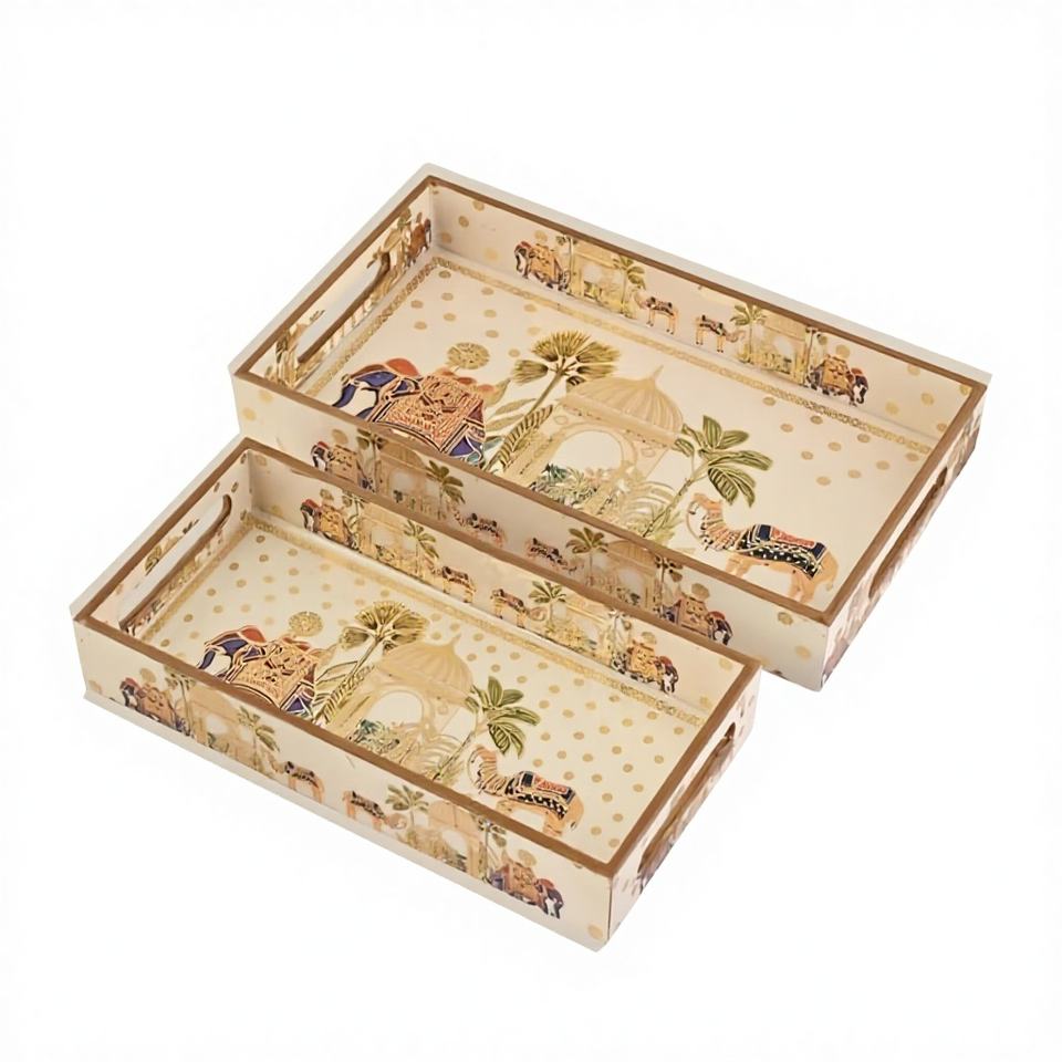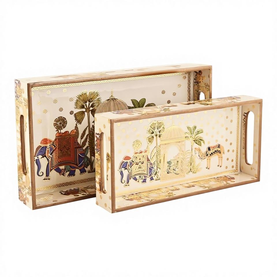 ถาดเสิร์ฟอาหารไม้เคลือบอีนาเมลลายสลักแบบอุตสาหกรรม ชุด 2 ชิ้น ลายพิมพ์ตัวอักษรดอกไม้ ภาชนะใส่อาหารปลอดสาร BPA