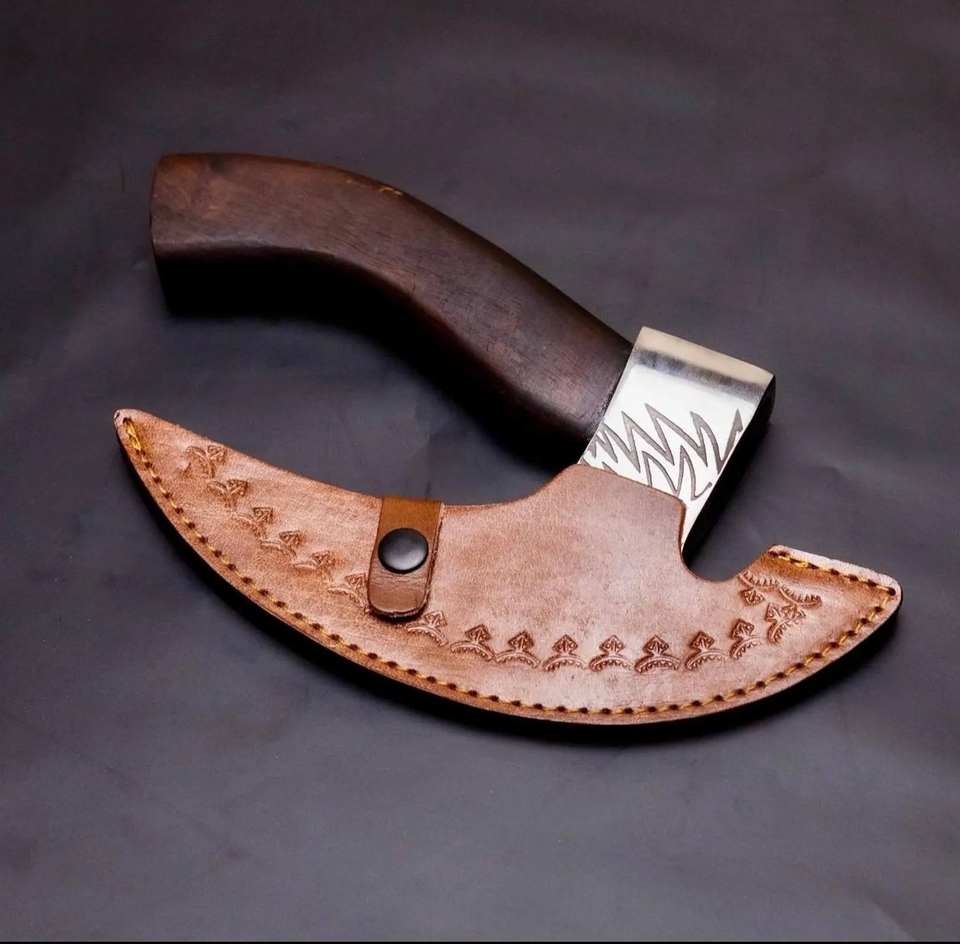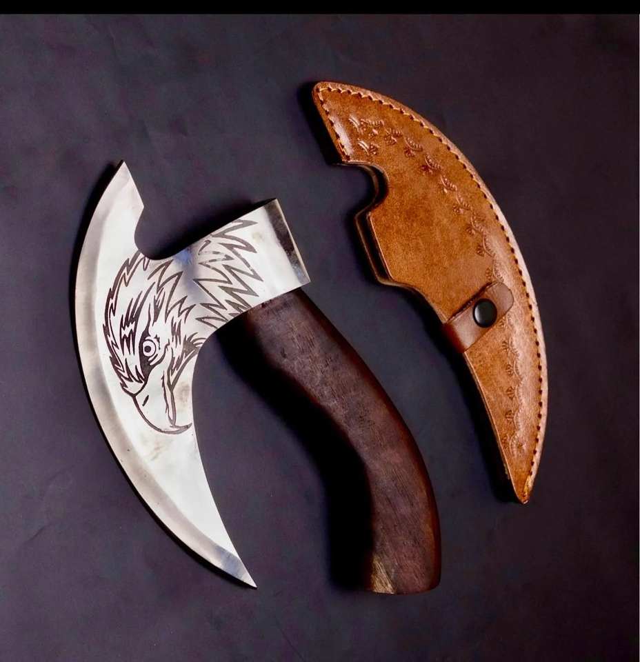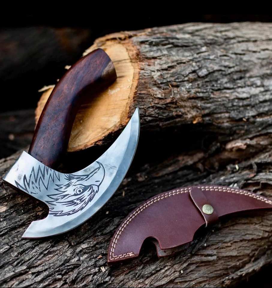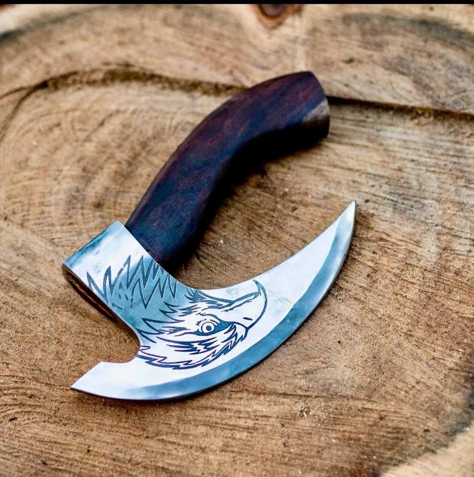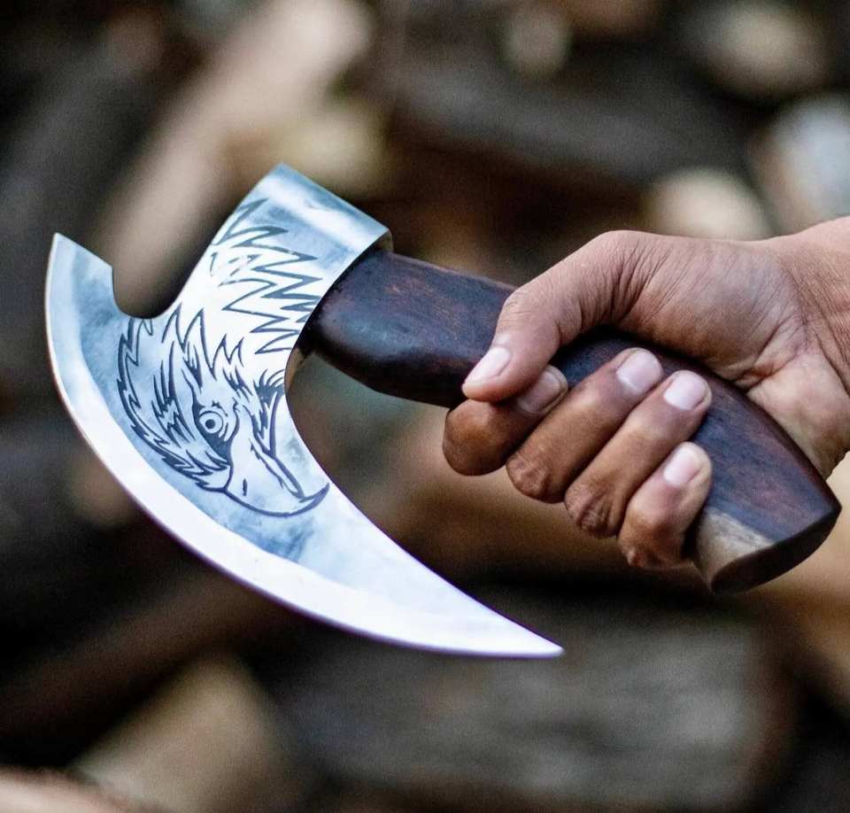 ขวานตัดพิซซ่าแบบวิกิ้ง งานตีขึ้นรูปด้วยมือ ระดับอุตสาหกรรมและงาน DIY ด้ามไม้โรสวูด เหล็กกล้าคาร์บอน พร้อมปลอกหนัง รับผลิตตามแบบ OEM
