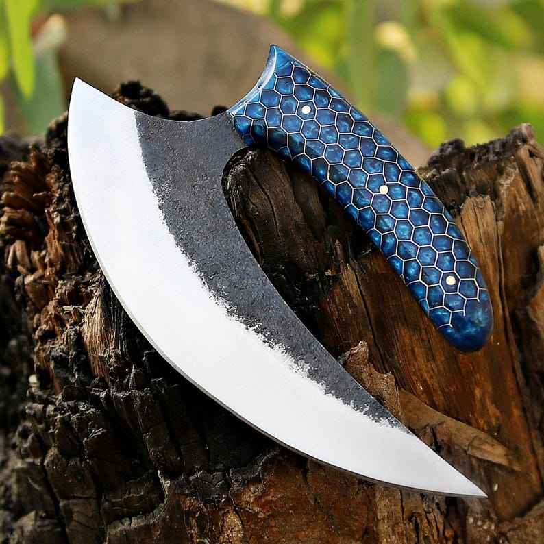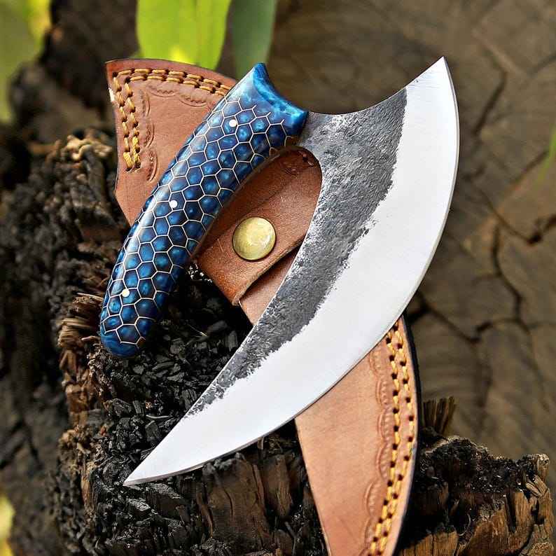 มีดตัดพิซซ่าเกรดอุตสาหกรรมแบบ OEM รูปทรงขวานสไตล์ไวกิ้ง ด้ามจับลายรังผึ้ง ทำด้วยมือ มีดตัดพิซซ่าแบบขวานไวกิ้ง ตีขึ้นรูปด้วยมือ