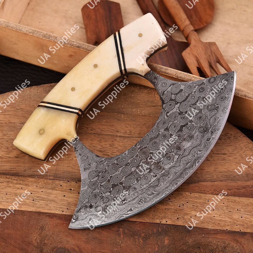 มีดเชฟอูลูเหล็กดามัสกัสเกรดอุตสาหกรรมคมกริบ ด้ามจับกระดูกอูฐ ใช้ได้ทั้งมือซ้ายและขวา พร้อมปลอกหนังอเนกประสงค์ รับผลิตแบบ OEM
