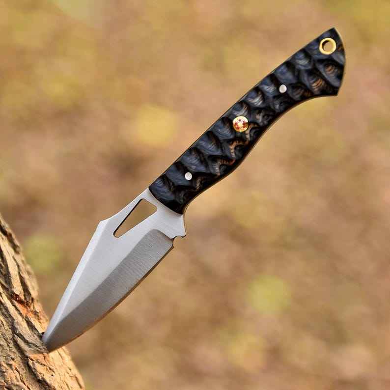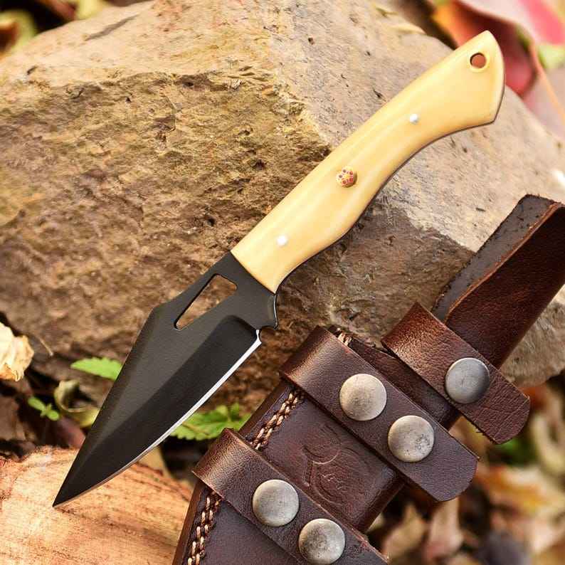 มีดล่าสัตว์กลางแจ้งแบบใบตายสำหรับตั้งแคมป์และเอาตัวรอด ผลิตตามมาตรฐาน OEM สำหรับอุตสาหกรรม ขายส่ง พร้อมด้ามจับทำจากไมคาร์ต้าและกระดูก วัสดุสแตนเลส