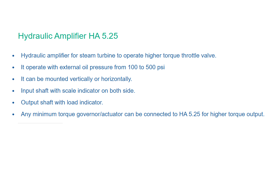 HA 5.25เครื่องขยายเสียงไฮดรอลิกอุตสาหกรรมที่เข้ากันได้กับระบบควบคุมกังหันไอน้ำแบบอิเล็กทรอนิกส์เพื่อการควบคุมกังหันไอน้ำที่มีประสิทธิภาพ