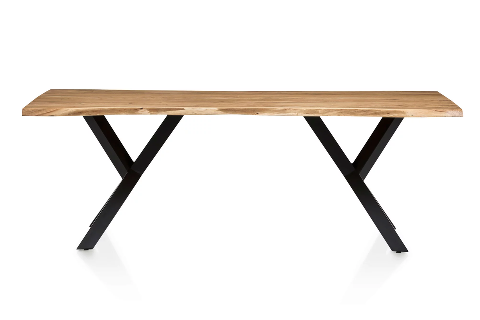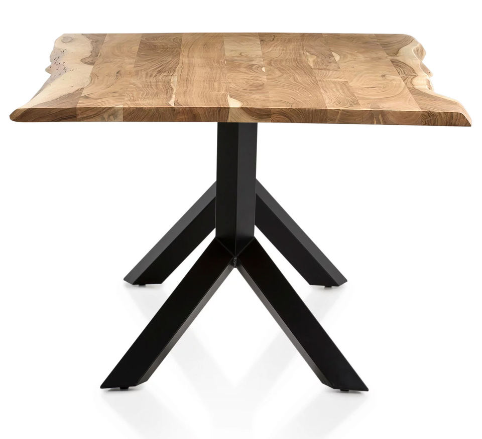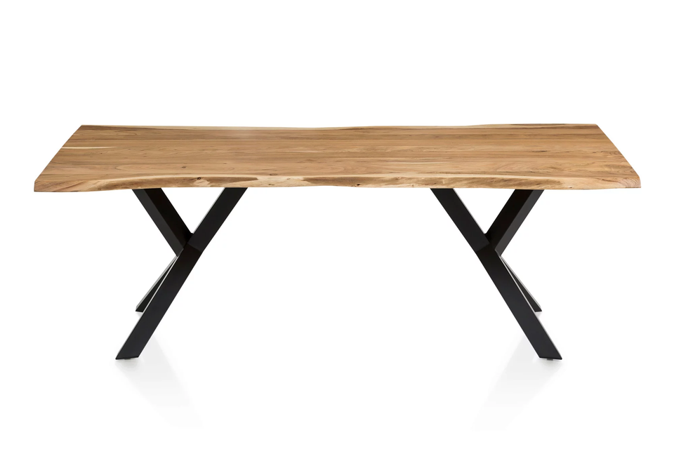 โต๊ะอาหารไม้แอคาเซียอินเดียขอบธรรมชาติ ขาเหล็กพับได้ สีดำและสีธรรมชาติ สำหรับบ้าน สำนักงาน ฟาร์มเฮาส์ ห้องครัว