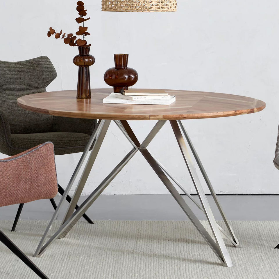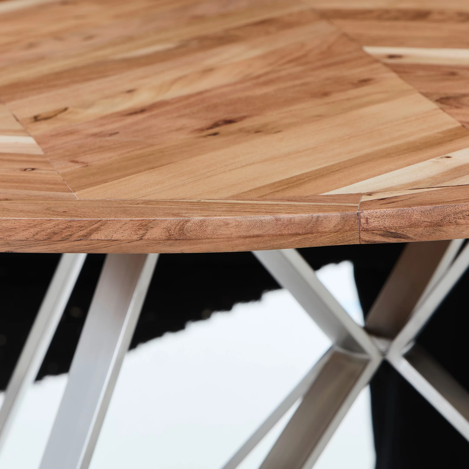 โต๊ะอาหารทรงกลมทันสมัยสำหรับบ้าน ดีไซน์ฐานโลหะแบบซิกแซก โครงโลหะแข็งแรง ท็อปไม้เนื้อแข็งอะคาเซีย