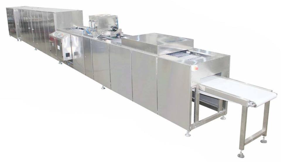 สายการผลิตขึ้นรูปช็อคโกแลตขนมถั่วลิสงแบบอุตสาหกรรมอุปกรณ์ขึ้นรูปช็อคโกแลตเวเฟอร์